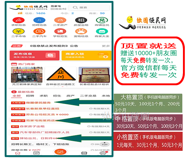 置顶信息始终显示在第一页,让您的信息得到更多展现机会。用户搜索信息时置顶信息也会优先显示。